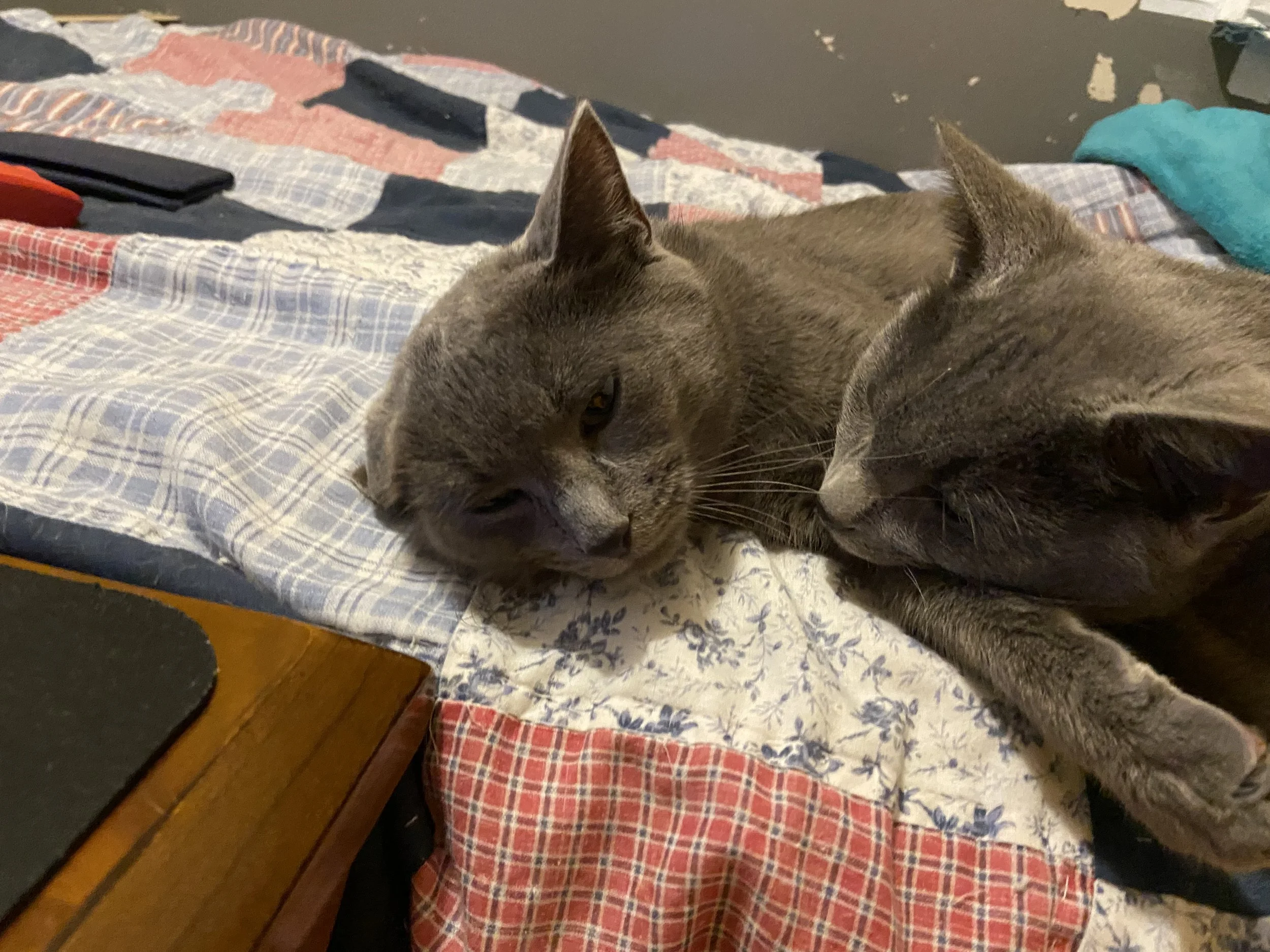 When I lay down in bed they just hop up beside me and settle in right next to my body so I can wrap my arms around them and pet them as they fall asleep. They sleep next to me at night, or at the foot of the bed. You don't have to go out of your way to connect with Ameretto and Storm. They're immediately cuddly and friendly cause they feel comfortable around people.