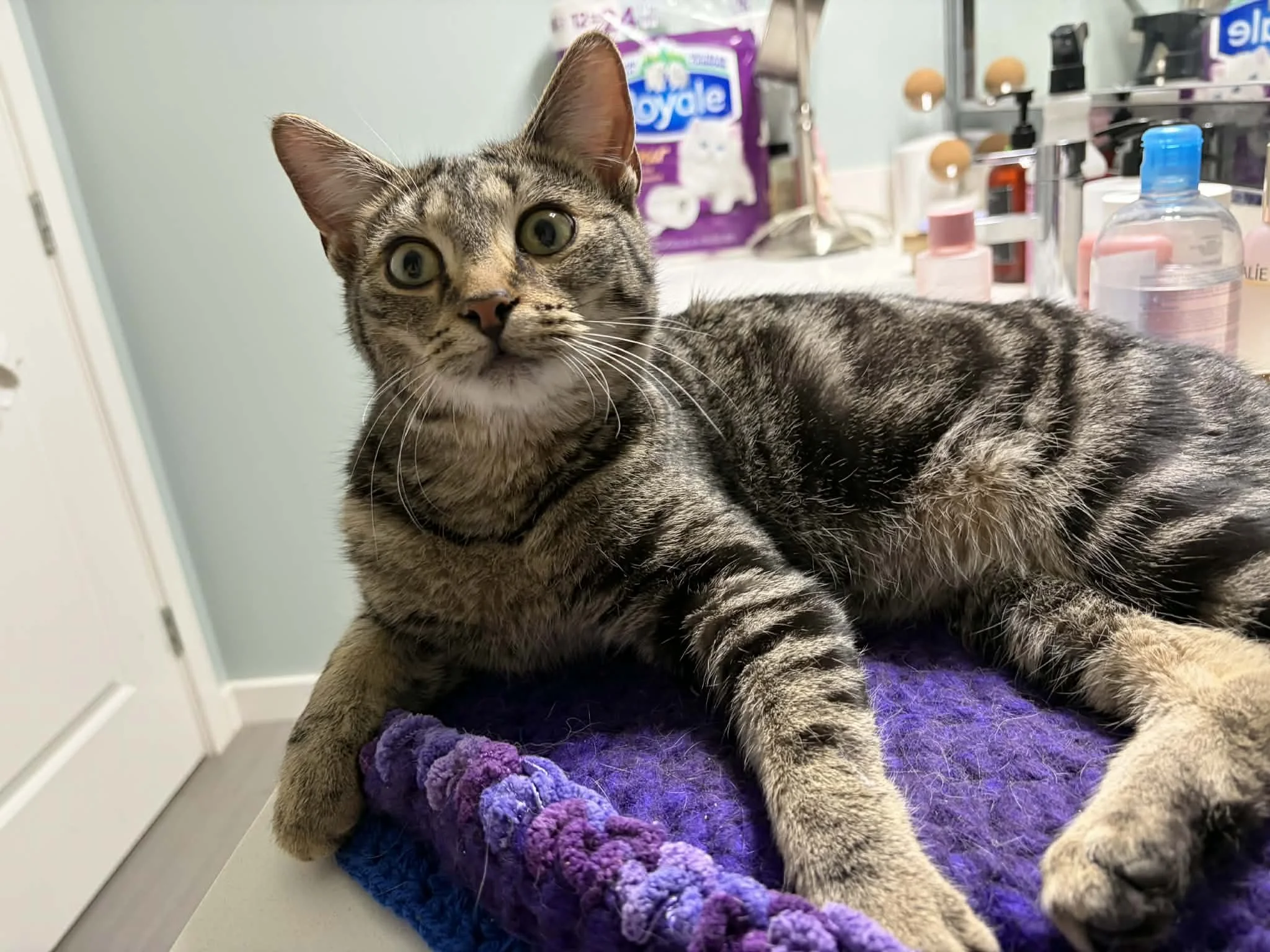 Bug loves, loves other cats and would thrive in a home with a playful feline companion to help him learn, wrestle, and continue discovering the world. He’s sweet, silly, and full of heart—an absolute joy in a tiny tabby package.