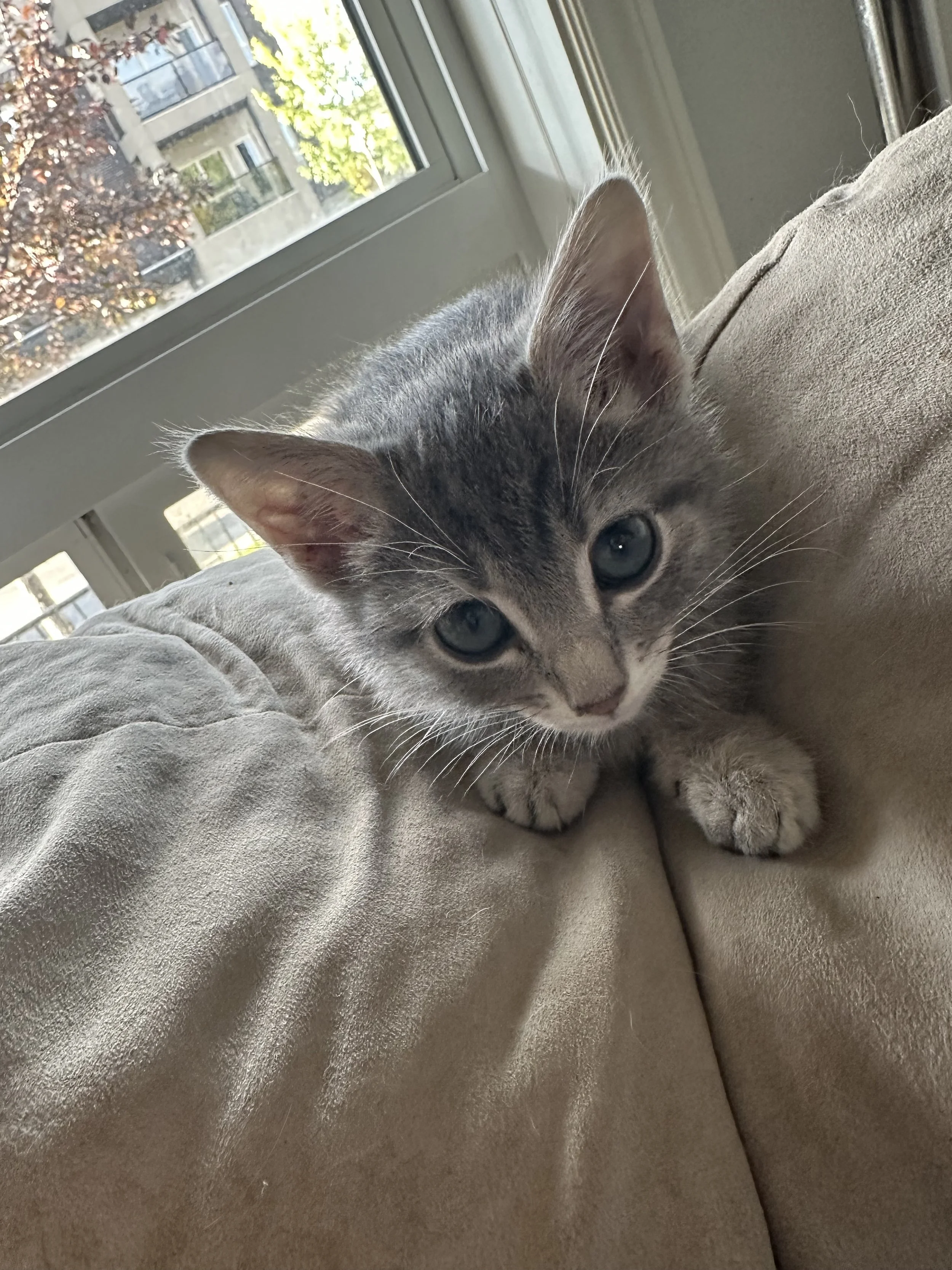 Hi everyone! My name is Griddle, and I’m a 5-month-old boy with a big heart and an even bigger purr! I have a stunning silvery-grey coat that gleams in the light and the most beautiful big green eyes you’ve ever seen.