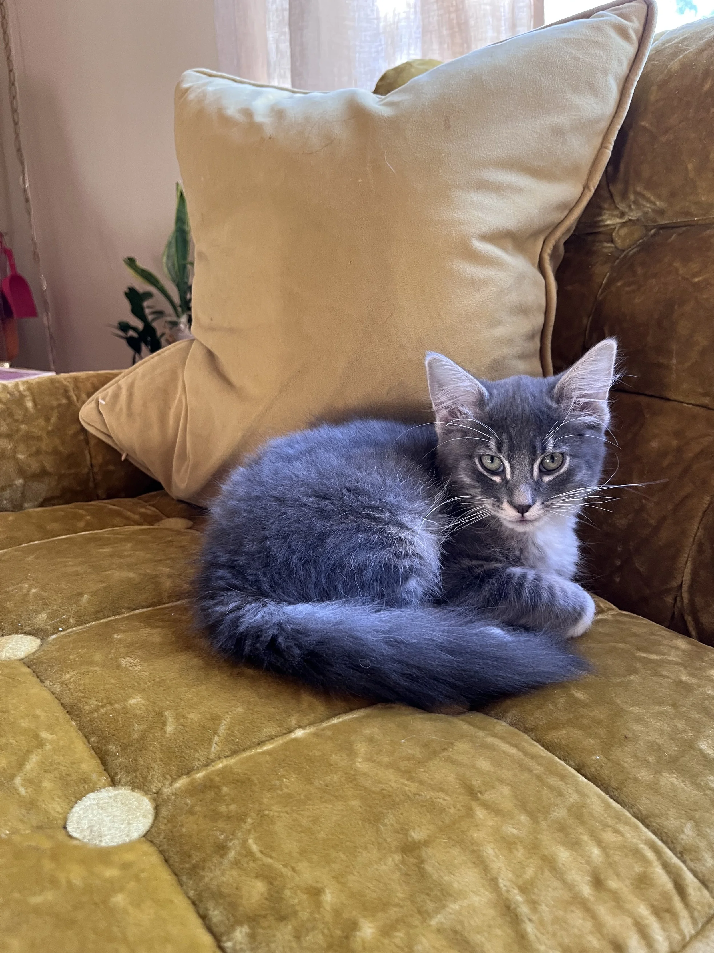 This is Max! He took to our home almost immediately! While our other cats took a bit of time to warm up and had to assert themselves, he was patient, and so very good with them. Now they happily play with him. He is a very happy and cuddly little man. So sweet, purrs so much and adores my children, as they do him.