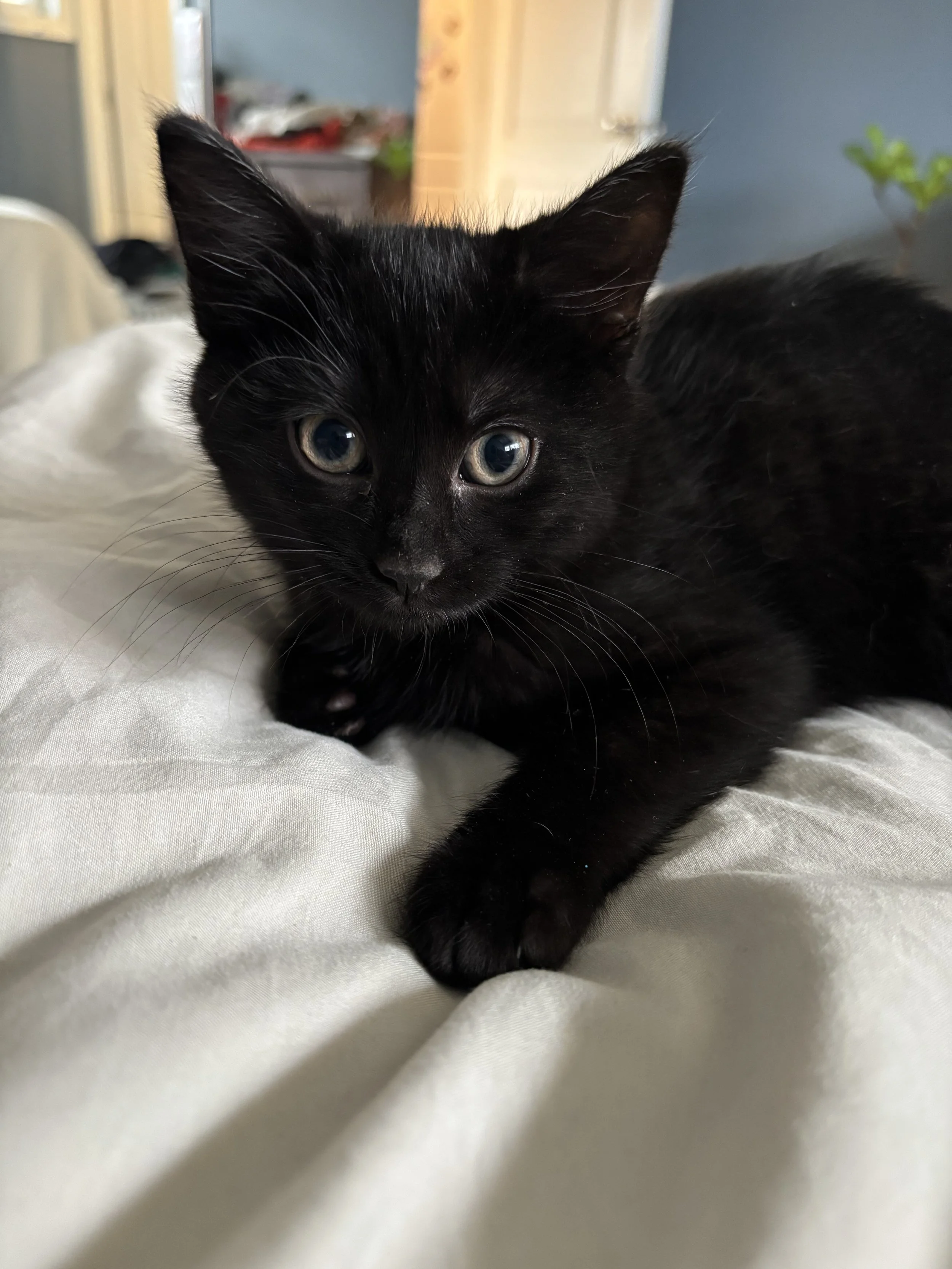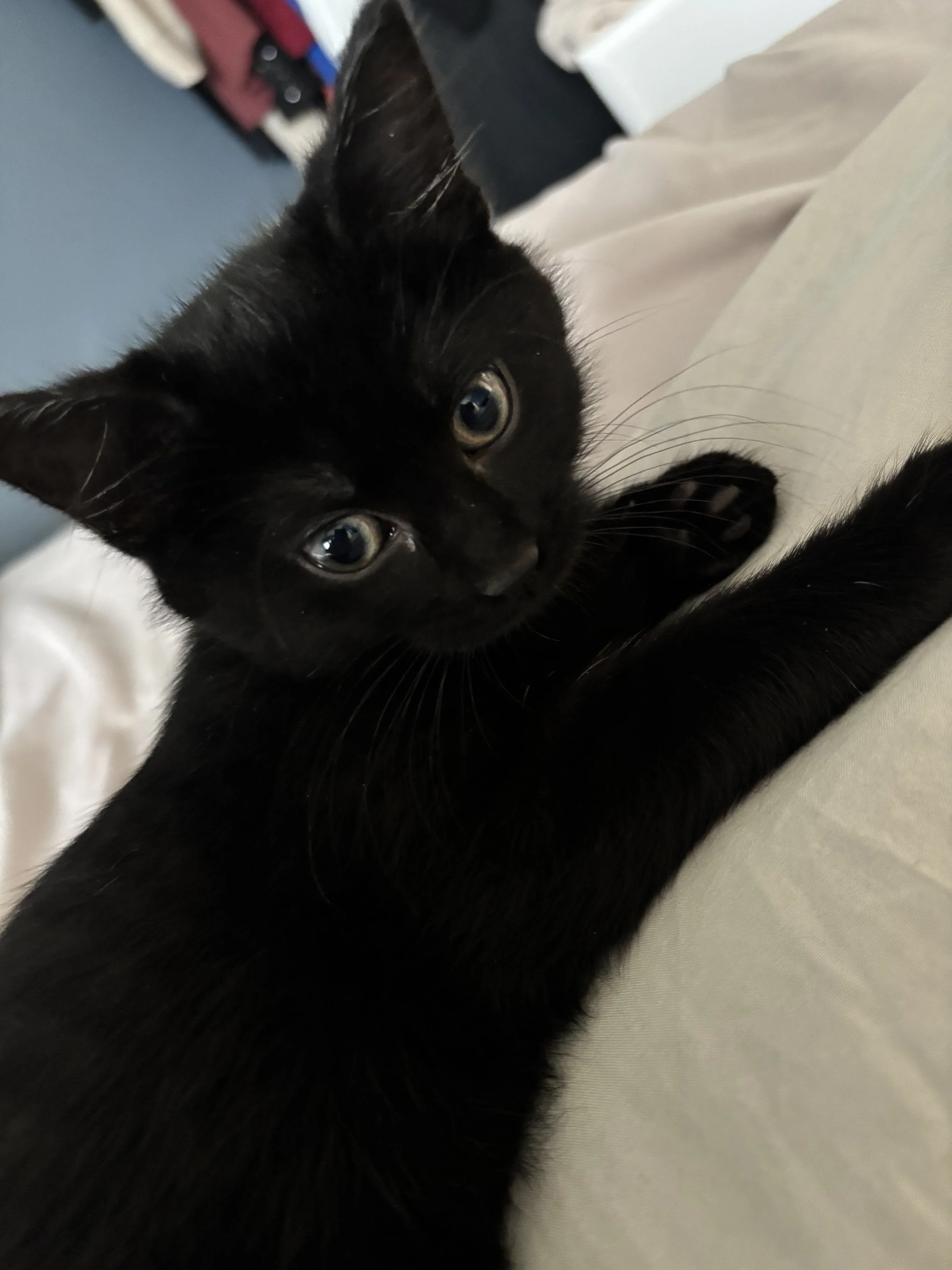 Meet Mars, the black kitten as sweet as the chocolate bar he’s named after. With his silky dark fur and melt-your-heart eyes, he’s basically the feline version of a treat you can’t resist. Mars loves nothing more than snuggling in close like he’s trying to wrap himself around you like caramel, all while delivering a chorus of gentle meows that are just as irresistible as a candy craving. Soft, sweet, and a little addictive—Mars is the sweetest bite of joy you’ll ever bring home.