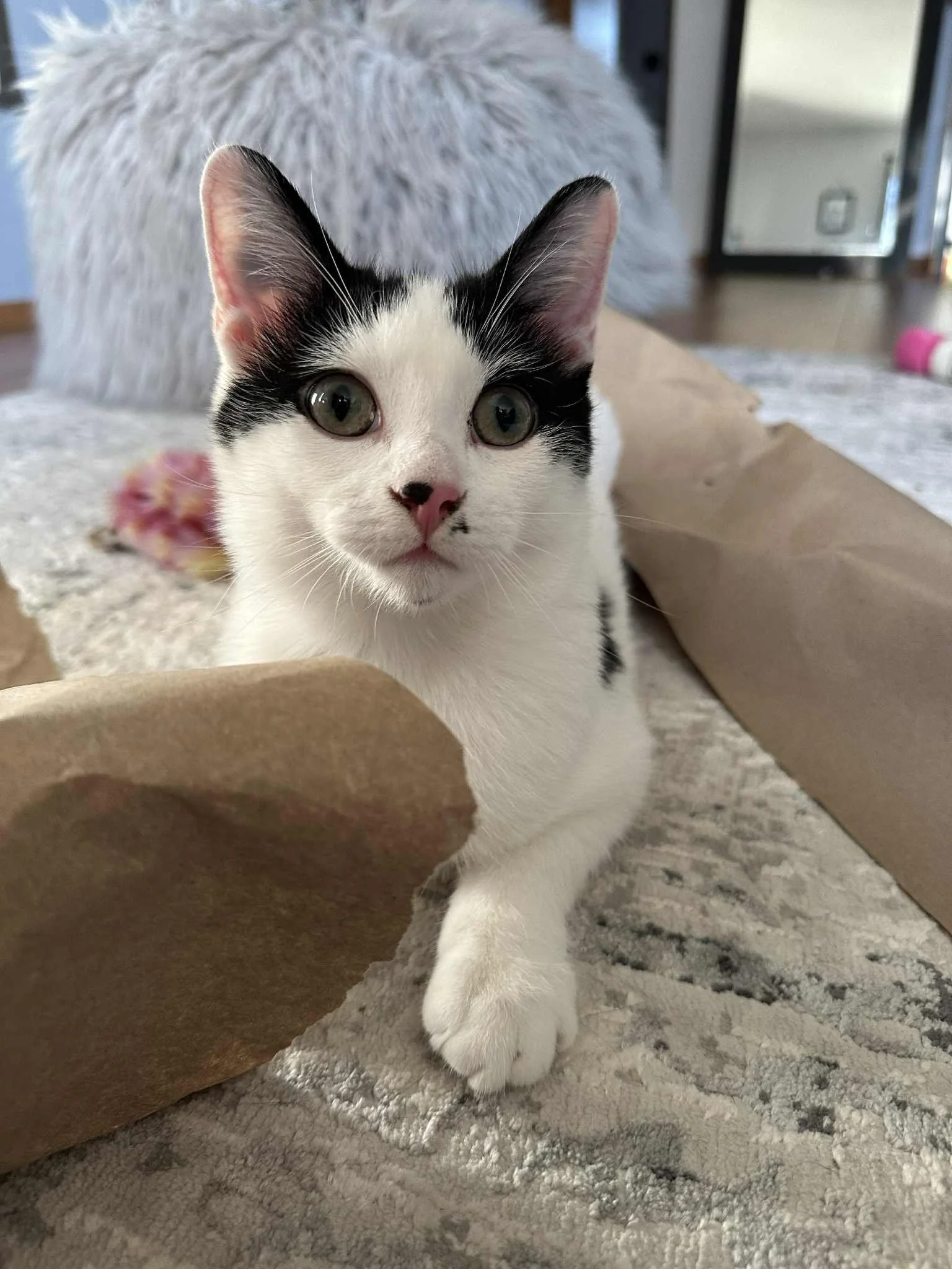 Cary may look like a classy white-and-black kitten, but he’s got the goofy soul of an orange cat through and through. Sweet, slightly clueless, and full of purrs, this little guy is pure joy.