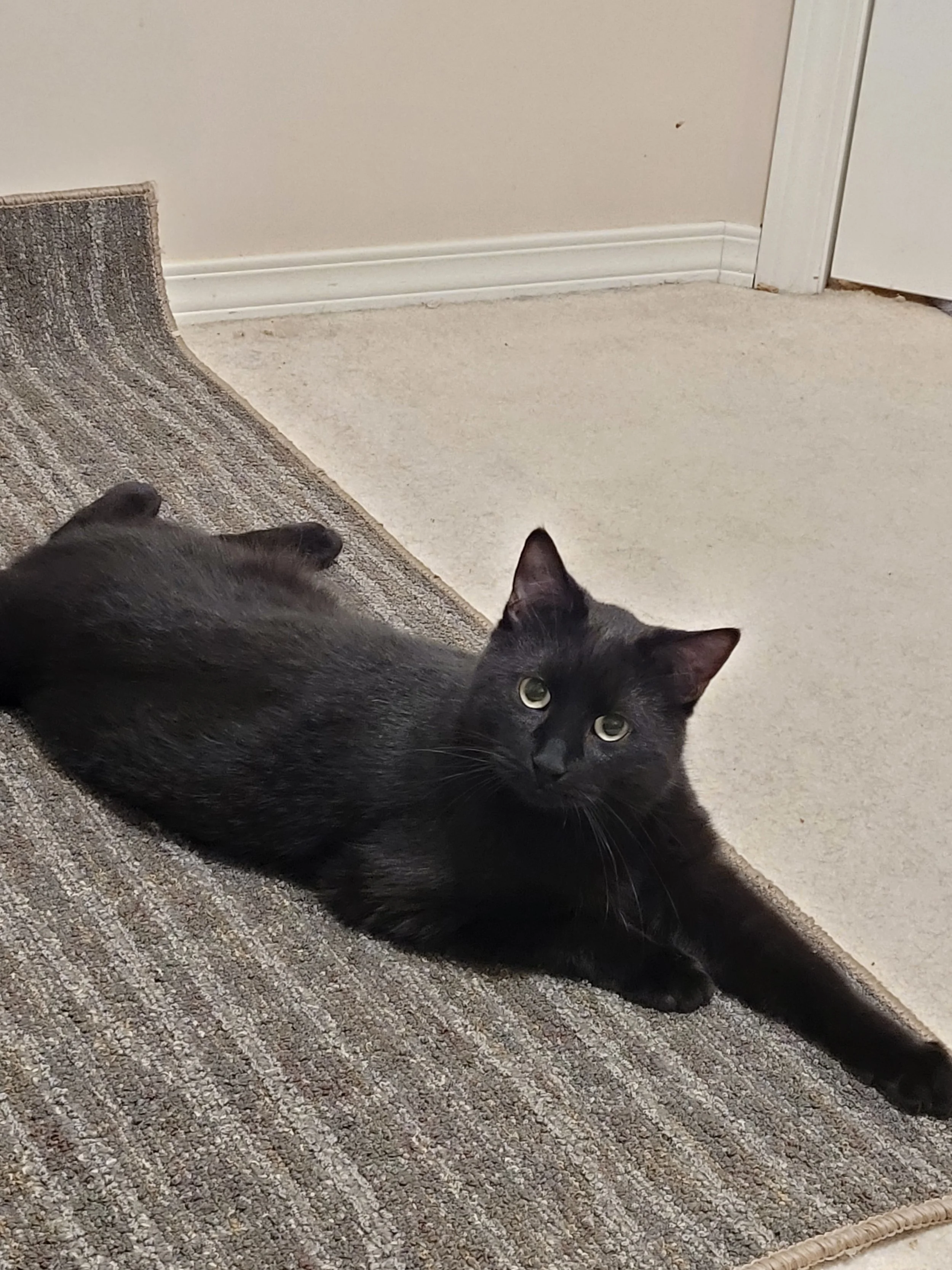 Sonny is a lovable, quirky black cat with a bent tail that just adds to his charm. He’s a goofy guy who lives for mealtime — you’ll definitely see his clumsy little zoomies and dramatic flops when dinner hits the bowl.